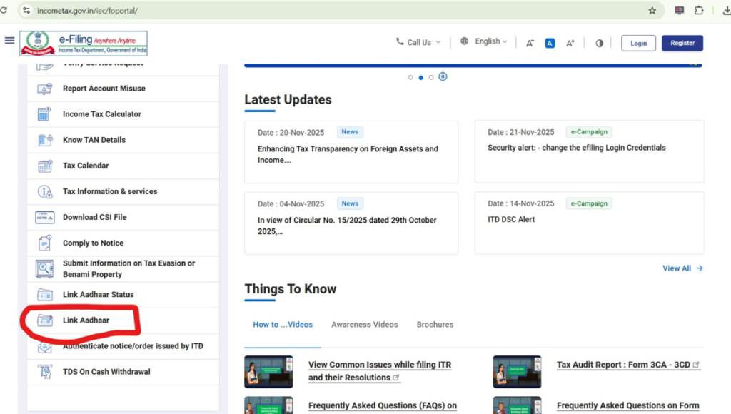 होमपेज पर आपको Link Aadhaar का विकल्प दिखाई देगा।